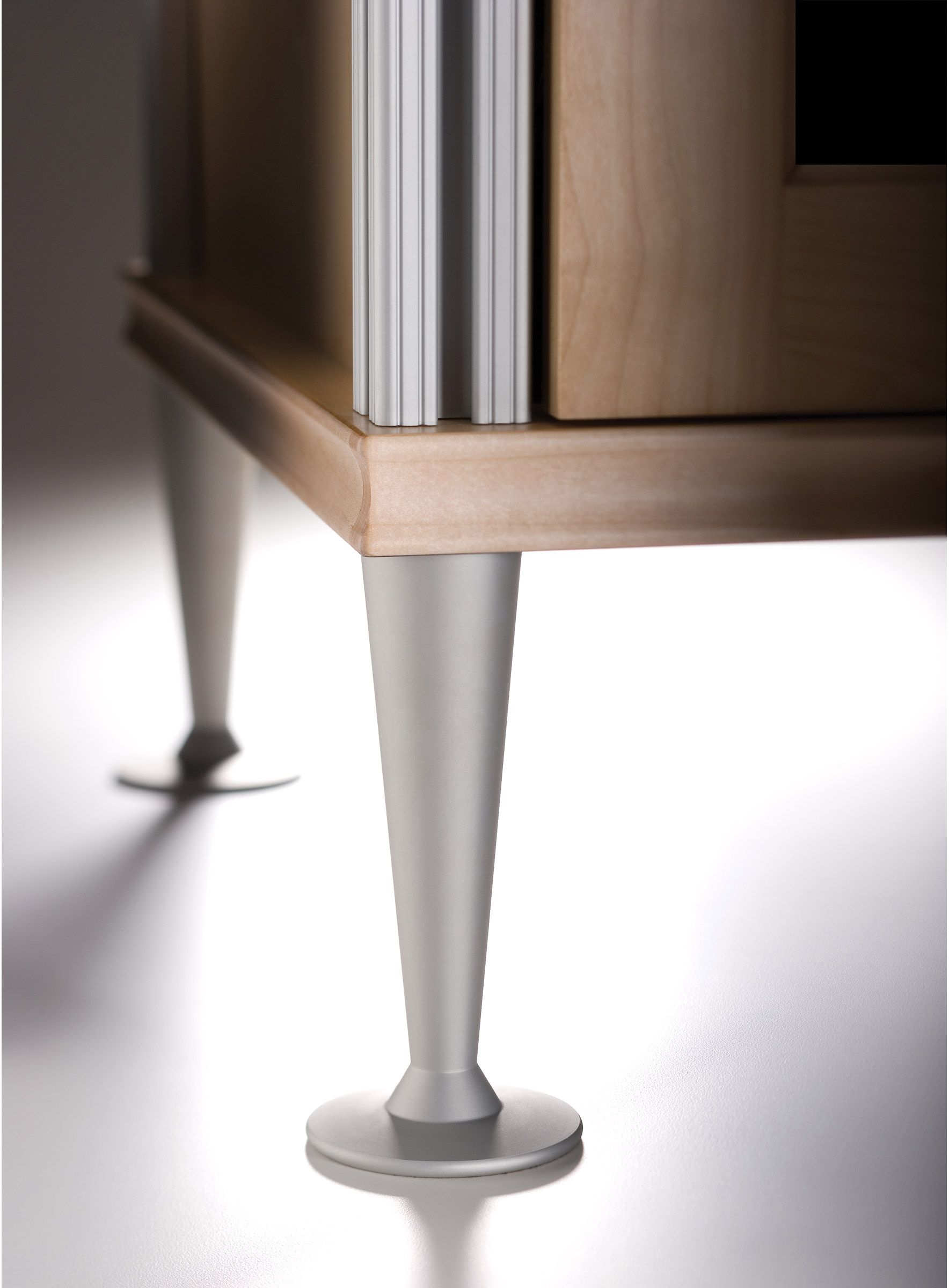 Dramatic, contemporary form elevates cabinets higher off the floor and adds stability.