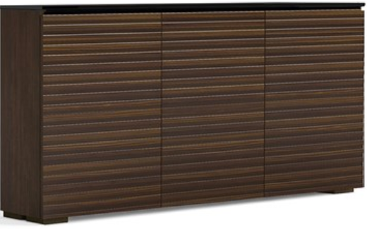 The sleek, streamlined design features a horizontal pattern on opium brown wood with a black glass or solid surface top and wood block feet. Features infinitely adjustable, black interior shelves, and built-in ventilation louvers for better air flow to keep equipment cool.