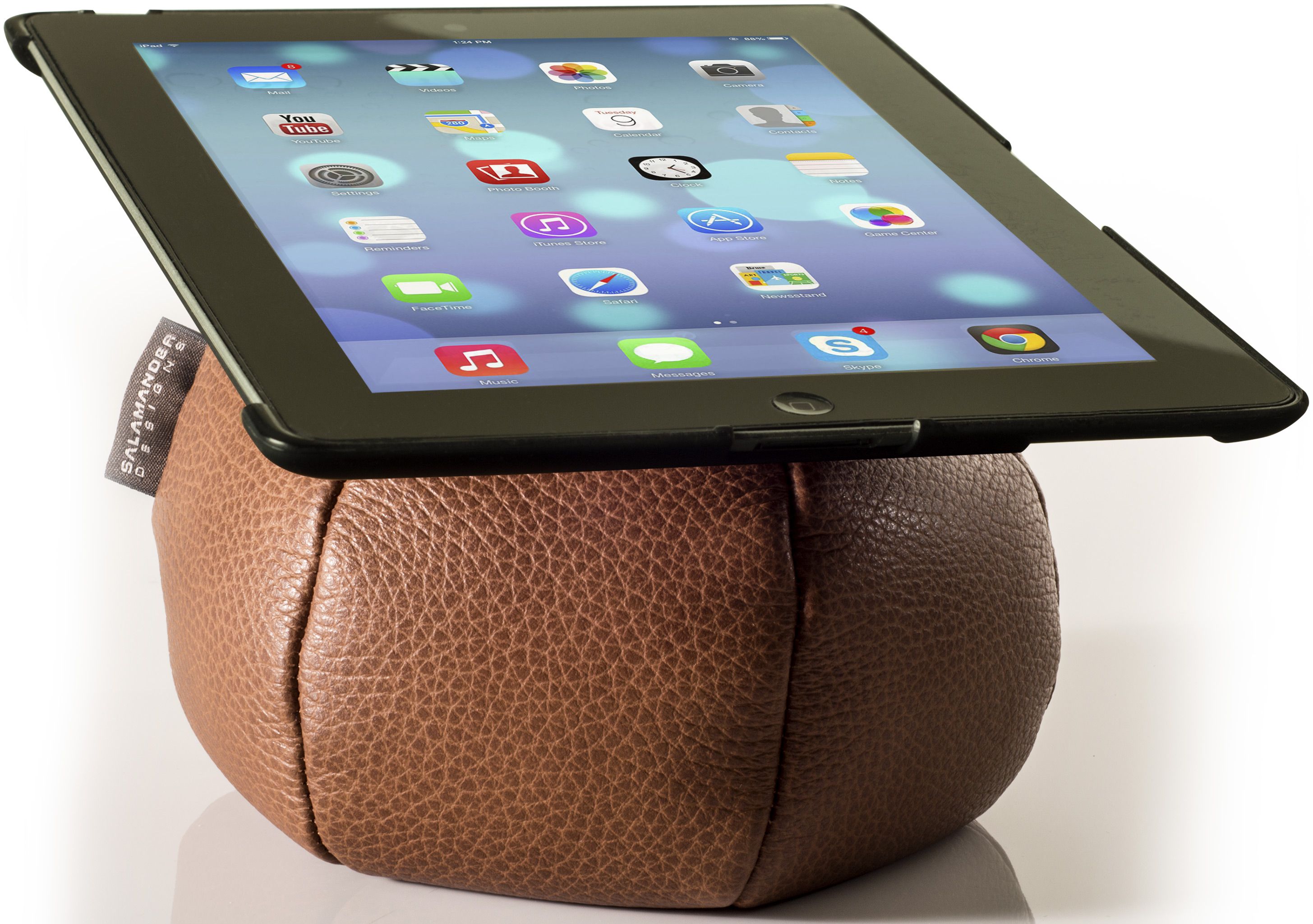 The innovative iPad Bean Bag Stand features a convenient mounting interface that doubles as a protective backing when detached from the base. The handmade, real leather bag easily conforms to any flat or irregular surface to provide a leveled viewing angle when curled up on the couch or riding in the car-you can even squish the base beneath a headrest for ideal backseat viewing.