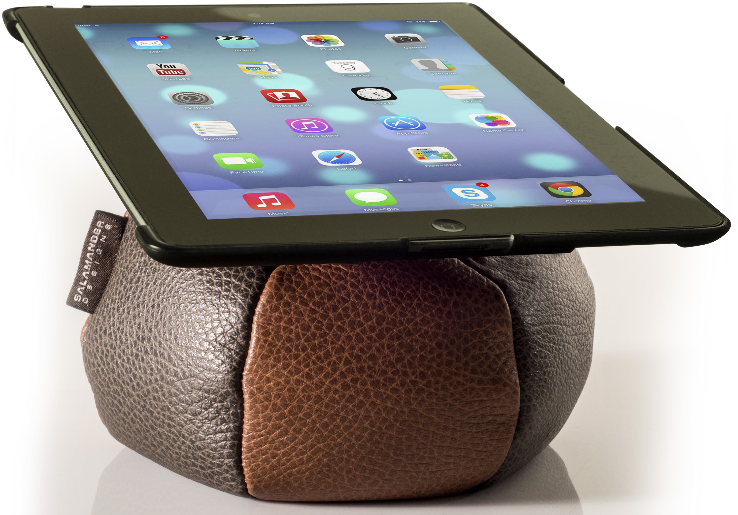 The innovative iPad Bean Bag Stand features a convenient mounting interface that doubles as a protective backing when detached from the base. The handmade, real leather bag easily conforms to any flat or irregular surface to provide a leveled viewing angle when curled up on the couch or riding in the car-you can even squish the base beneath a headrest for ideal backseat viewing.